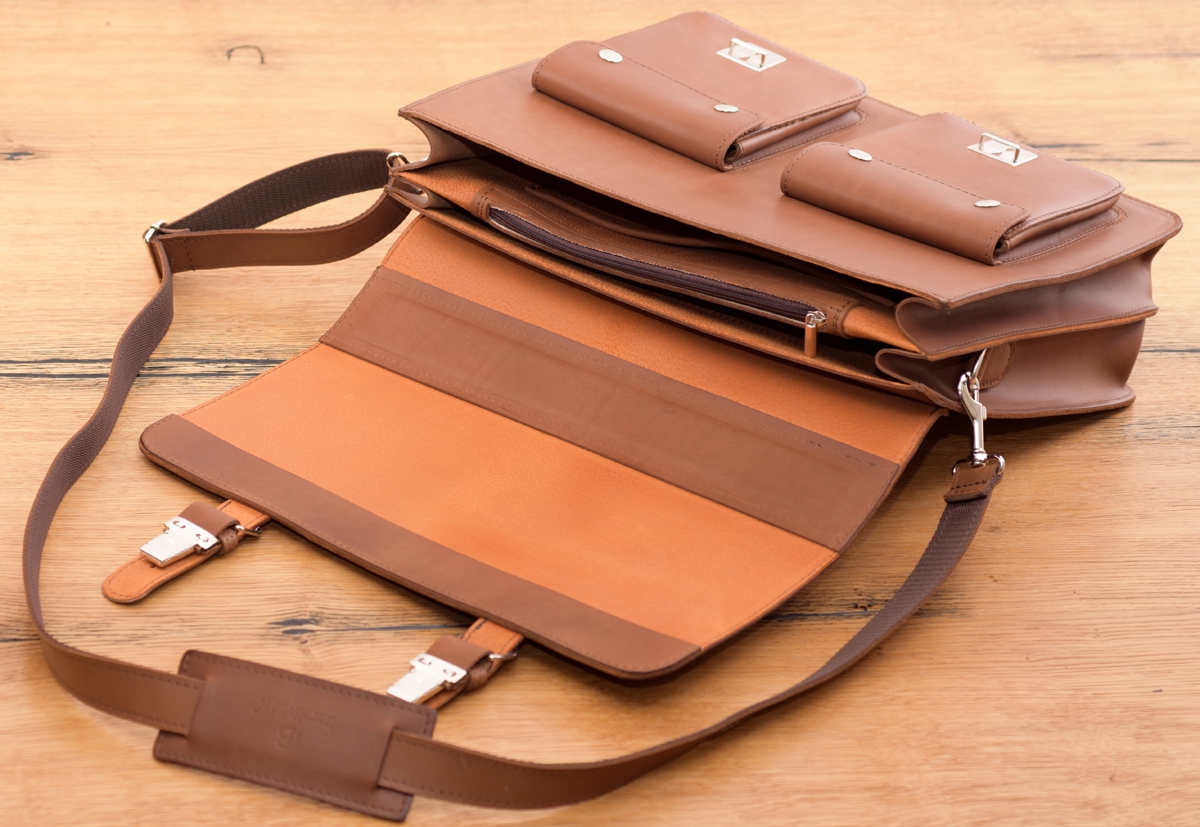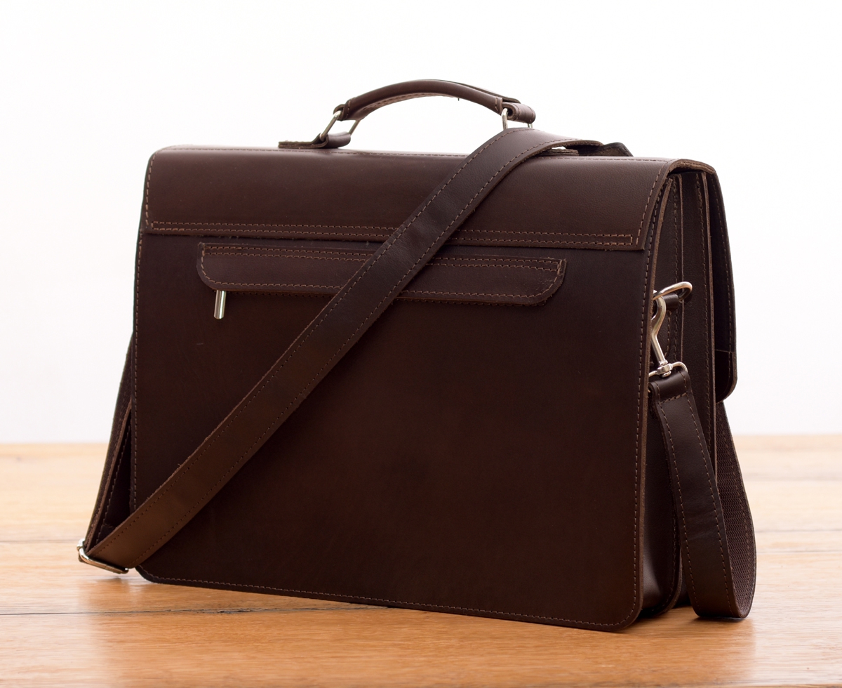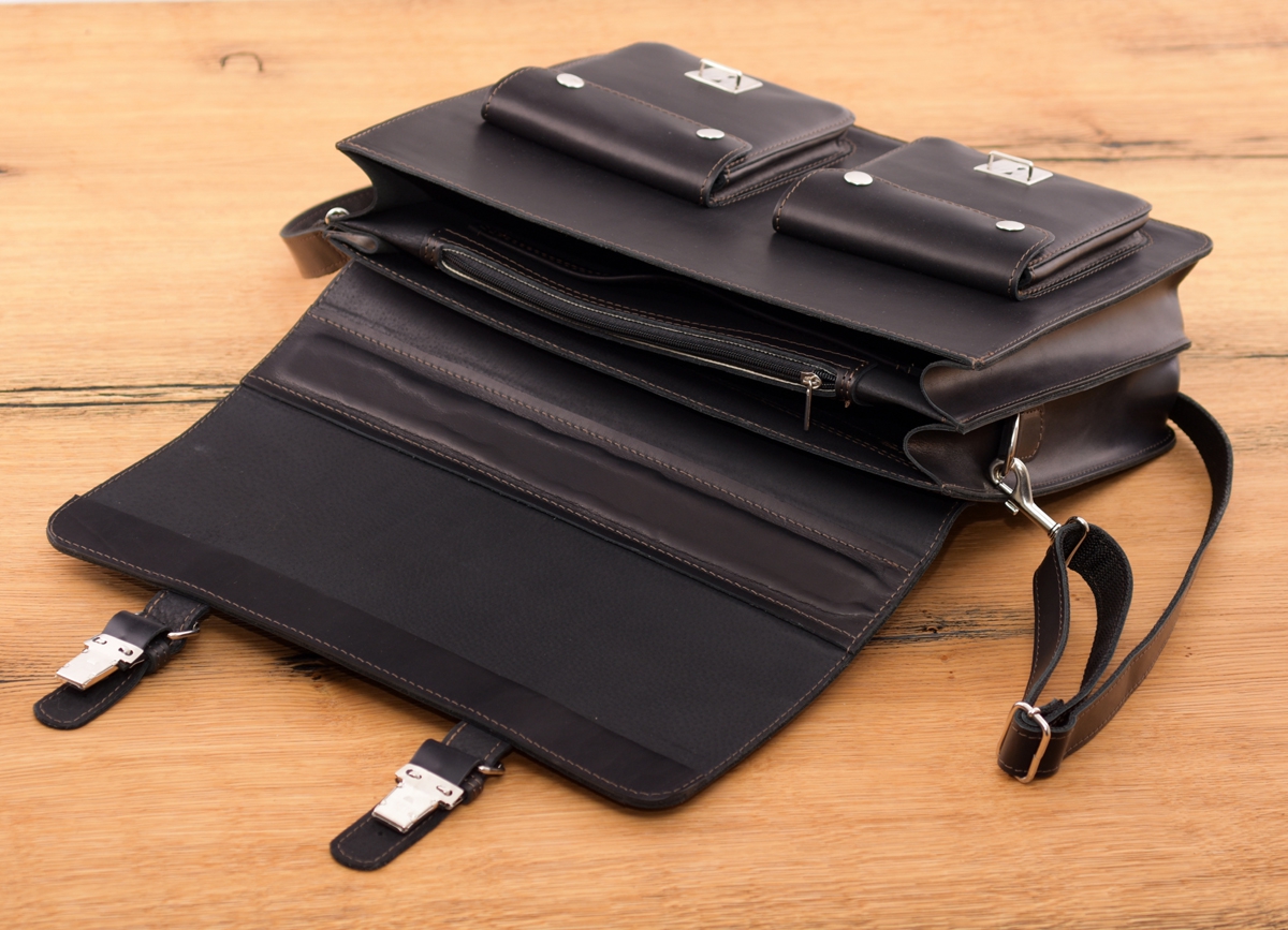 Dark to teczka skórzana wyposażona w dwie komory i dzielący je skórzany przedziałek zamykany. Pod klapą umieściliśmy dwie dodatkowe zamykane kieszenie, a z tyłu jedną zamykaną na zamek błyskawiczny. W środku teczka posiada dodatkowe przegródki na telefon, długopisy czy wizytówki. Dzięki regulowanemu paskowi bez trudu można dopasować teczkę do siebie, a dzięki rączce u góry - jest ergonomiczna i bardzo wygodna.