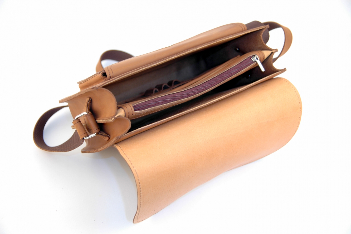 • Zadbaliśmy o to, aby była pojemna - ma aż dwie komory i wygodną kieszeń pod klapą torebki, która jest zamykana na nap. W komorach spokojnie możesz nosić tablet, notes, kalendarz, duży portfel, składany parasol, małą butelkę wody, telefon. W środku są szlufki na długopisy, wsuwana otwarta kieszonka oraz jedna zasuwana na zamek, która dzieli komorę na dwie części.