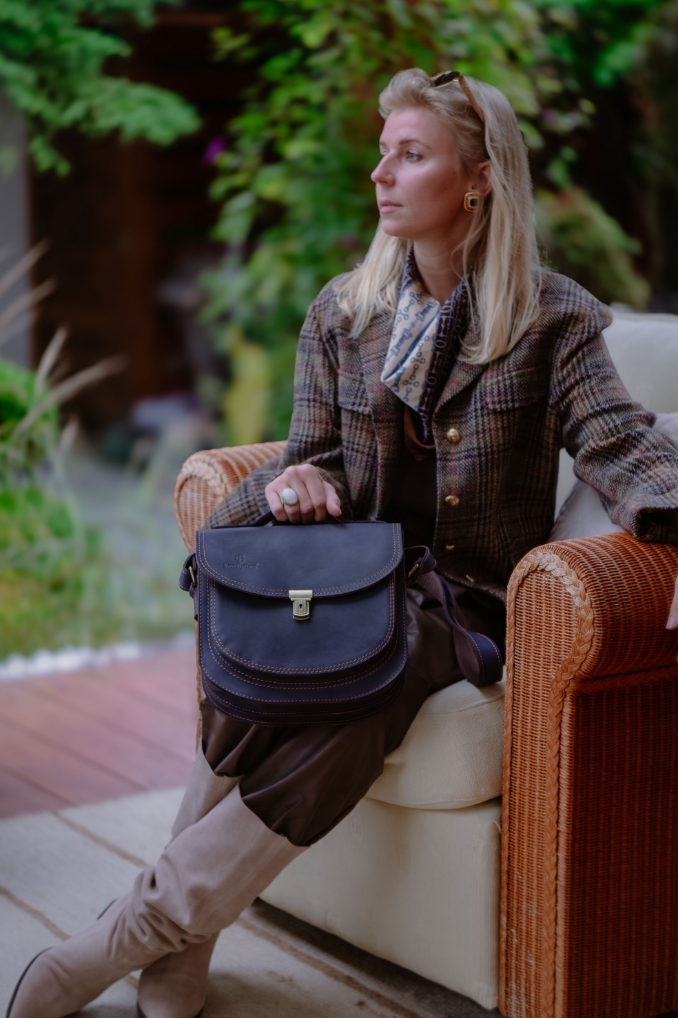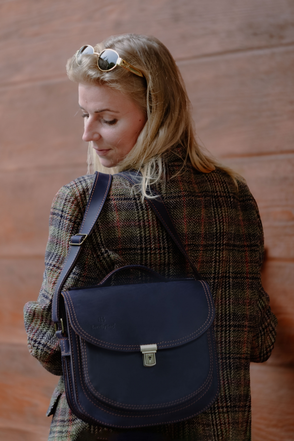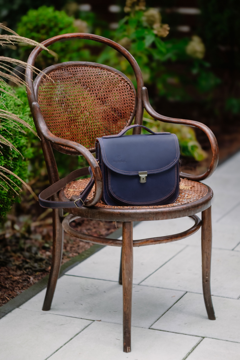 - Posiada ona również rączkę z podwójnego pasa skóry, przynitowaną do wzmocnionej klapy