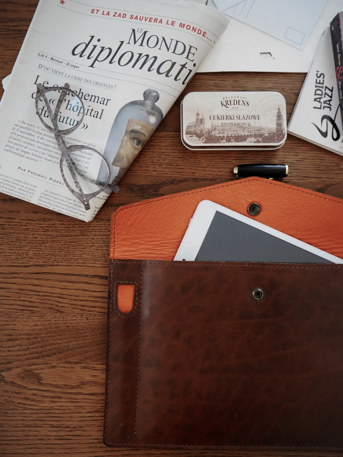 Chcielibyśmy zaprezentować Wam naszą nowość. Piękna bydlęca skóra z zewnątrz, a w środku mięciutka w dotyku skórzana podszewka licóweczka. Jakie jest zastosowanie? Może to być etui na Waszego Tableta, IPada, IPada Air do 11 cali. Może to być aktówka na ulubiony dziennik, czy kalendarz, jest również miejsce na pióro, długopis albo rysik. Ale możesz w nim swobodnie zmieścić także portfel, smartfona, klucze i zabrać ze sobą jako podręczną aktówkę.