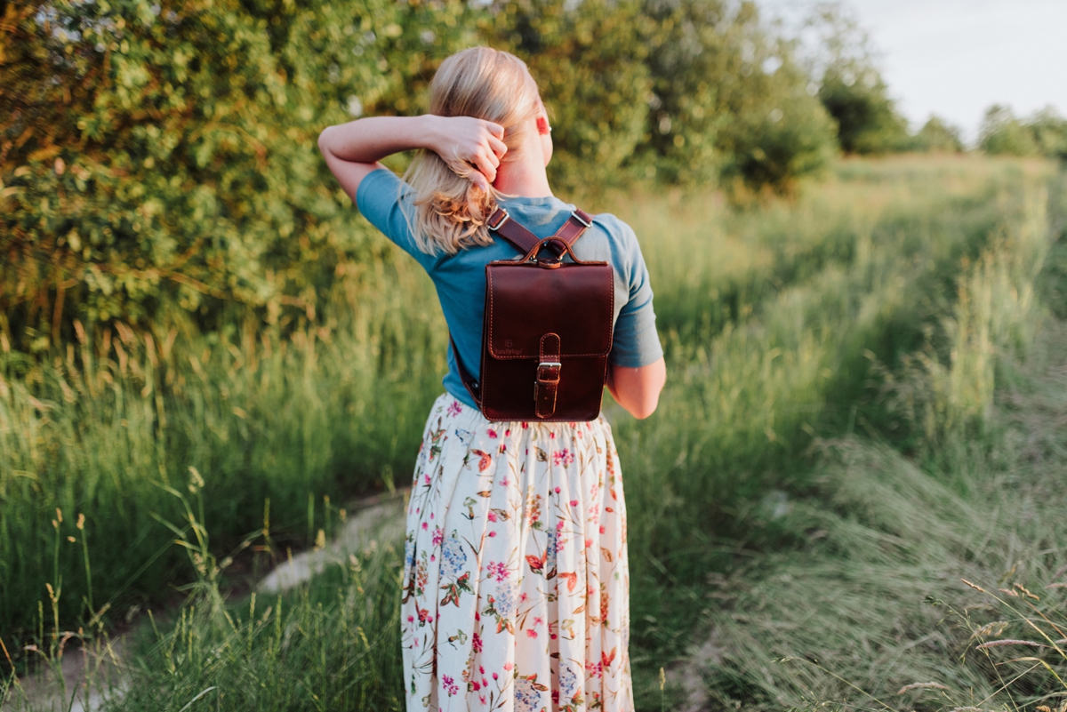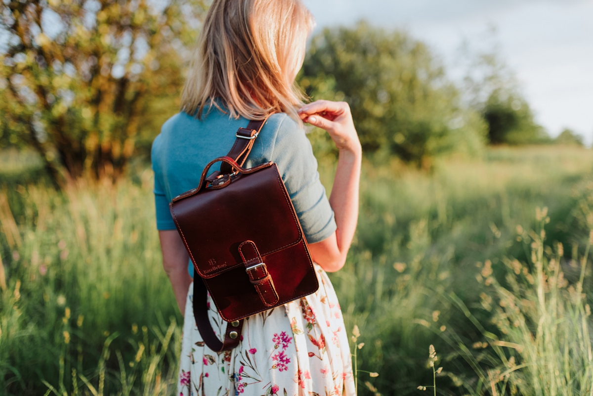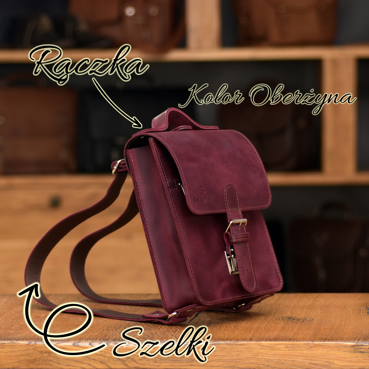 Skórzany plecaczek o wymiarach 20cm długości na 24cm wysokości (mierzona bez rączki). Na zdjęciu Monika 170cm wzrostu, tak więc macie odniesienie co do rzeczywistych wymiarów torby. Wyposażyliśmy go w dwie odpinane wygodne szelki z naramiennikami. Szelki można całkowicie zdjąć, a torbę można nosić również do ręki jako aktóweczkę.