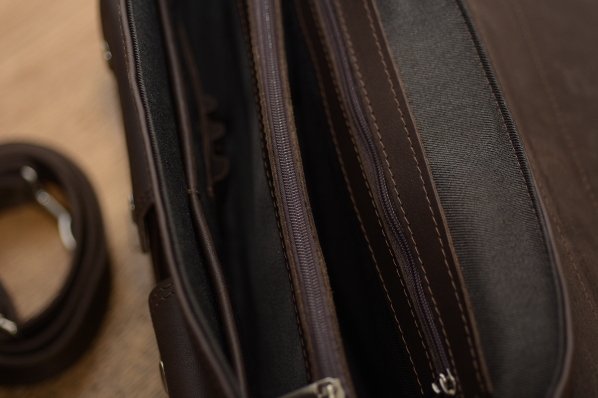 Wielofunkcyjna, klasyczna. Z tyłu jest kieszonka zasuwana, w środku jest komplet kieszonek: jedna na zamek, dwie otwarte wsuwane, szlufki na długopisy i jedna mała kieszonka na wizytówki. Pod klapą znajdują się dwie kieszenie zamykane na napy o wymiarach 15cm dłx16cm wys.