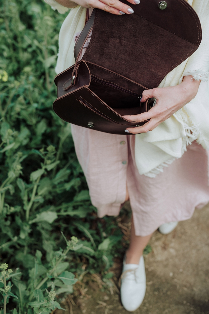 Całą ozdobą torby jest klapa o finezyjnym kształcie, taka podkowa i kilka delikatnych przeszyć. Tył gładki. Pod klapą znajdziecie kieszonkę na suwak. Wymiary torebki - w górnej części ma 20cm, a w dolnej 24cm szerokości. Pasek regulowany. W środku jest zasuwana kieszonka.